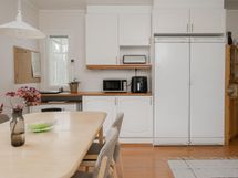 Jääkaappi, pakastekaappi, sähköliesi, liesituuletin, astianpesukone, kaapistot, kiinteät valaisimet.