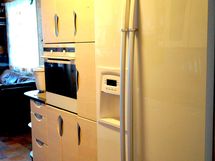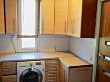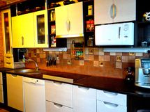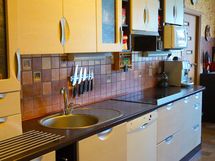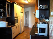 Tilaa isolle ruokapöydälle, Paljon kaappitilaa, Paljon työskentelytilaa, Laminaattitasot, Lasikaapit, Astianpesukone, Integroidut kodinkoneet, Sähköliesi, Liesituuletin, Liesi ja uuni erikseen, Jääkaappi, Jää-viileäkaappi, Pakastin