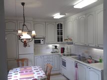 - Tilaa isolle ruokapöydälle, Paljon työskentelytilaa, Paljon kaappitilaa, Kivitasot, Astianpesukone, Keraaminen liesi, Liesituuletin, Jää-pakastinkaappi, Pesukoneliitos, Suuri tiskipöytä, Lasikaapit, Liesi tai uuni erikseen