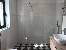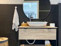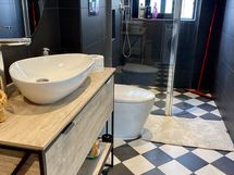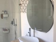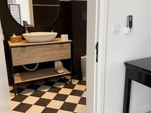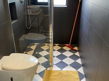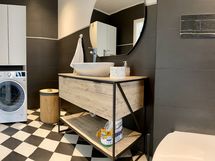 - Suihku, Useita suihkuja, Pesukone, Allaskaappi, Laattaseinä, Halogeenivalot, Avattava ikkuna