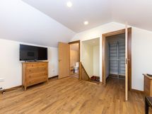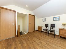 Kerrokseen pääsee leveitä tammiportaita pitkin.