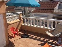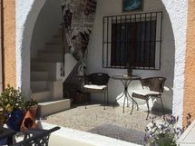 Saunallinen, kodikas rivitaloasunto omalla pihalla sekä aurinkoterassilla, kolmio kahdessa kerroksessa rauhallisella vehreällä asuinalueella La Siestassa ( Torrevieja).