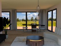 Seinät rakennetaan puusta, perustus eristetään 300 mm EPS-paneeleilla. Julkisivun viimeistely materiaaleina käytetään puuta ja laadukasta profiilipeltiä. Talossa on vesikiertoinen lattialämmitys, lämmönlähteenä on suunniteltu ilmalämpöpumppu. Lämmön talteenotolla varustettu pakko ilmanvaihtokoneella. Vesi tulee vasta rakennetusta porakaivosta, ja viemäriliitäntä on ratkaistu imeytyskentällä. Nauti upeasta näköalasta terassilta tai huoneesta lattiasta kattoon ulottuvien ikkunoiden kautta.