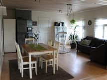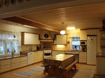 Paljon kaappitilaa, Tilaa isolle ruokapöydälle, Puutasot, Terästasot, Astianpesukone, Keraaminen liesi, Liesituuletin, Jääkaappi, Pakastin, Liesikupu, Pesukoneliitos, Halogeenivalot