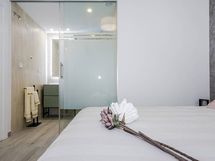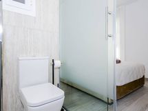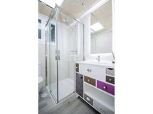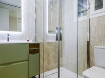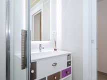 Varustus: suihkuseinä, wc-istuin, suihku, peilikaappi, kiinteät valaisimet. Varustus: suihku, suihkuseinä, peilikaappi.