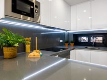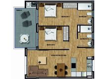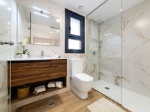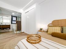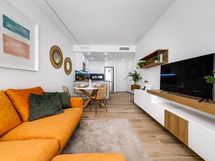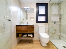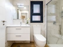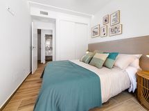 Tämä huoneisto on viihtyisä, jossa on kaksi makuuhuonetta ja kaksi kylpyhuonetta, moderni ulkoasu ja suuri terassi. Talot sijaitsevat niin että ne saavat valoa ja lämpöä auringosta ympäri vuoden.