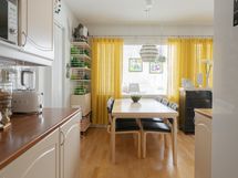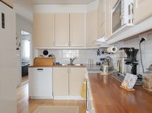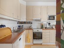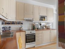 - Keittiön varusteet: Jääkaappi (uusittu 2020), erillinen pakastin (uusittu 2020), erillisuuni (uusittu 2021), liesi (uusittu 2020), astianpesukone (uusittu 2020-2021) ja liesituuletin. Liesi: Induktioliesi. Työtason materiaali: Laminaatti.