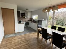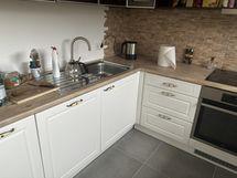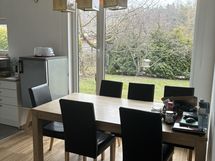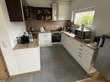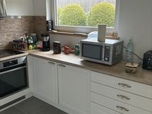 Tilaa isolle ruokapöydälle, Paljon kaappitilaa, Paljon työskentelytilaa, Puutasot, Astianpesukone, Integroidut koneet, Sähköliesi, Liesikupu, Jääkaappi, Pakastin
