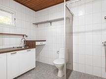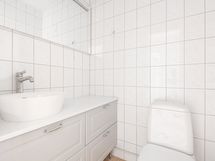 Varusteet: WC-istuin, lattialämmitys, peili, pesuallas, allaskaappi ja bidee-suihku