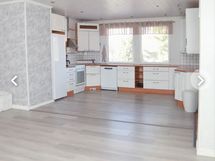 Tilaa isolle ruokapöydälle, Paljon kaappitilaa, Paljon työskentelytilaa, Lasikaapit, Laminaattitasot, Astianpesukone, Pesukoneliitos, Sähköliesi, Induktioliesi, Liesikupu, Liesituuletin, Jääkaappi