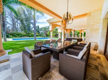 Ulkopuolella rehevät trooppiset puutarhat ympäröivät kotia luoden rauhallisen keitaan. Suuri lämmitetty uima-allas, viehättävä lampi vesiputouksella ja varjoisa kesäpergola kypsien palmujen alla tarjoavat täydelliset puitteet rentoutumiseen ja ulkoiluun. Kiinteistössä on myös täysi kehäturvallisuus, kuuden auton autotalli ja erilliset henkilökunnan tilat yksityisyyden ja mukavuuden lisäämiseksi.