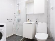Pesutilojen varusteet: WC-istuin, suihku, suihkuseinä, pesukoneliitäntä, peilikaappi, allaskaappi ja bidee-suihku. Pesutilojen kuvaus: Pesuhuone remontoitu 2016.