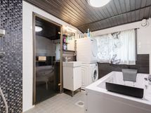 Sisätilat ovat viihtyisät ja käytännölliset. Kolme makuuhuonetta tarjoavat tilaa perheenjäsenille, ja olohuoneessa on lämpöä varaava takka, joka luo tunnelmaa kylminä iltoina. Pesuhuone ja sauna ovat uudistettu vuosina 2018-2019, ja pesuhuoneessa on lattialämmitys, joka lisää mukavuutta.