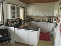 Yläkerrassa sijaitsevat kolme makuuhuonetta, avara olohuone, keittiö, pesutila/wc, jossa