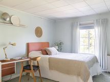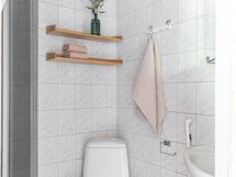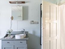 - Pesutilojen kuvaus: Lattia ja seinät laatoitetut. Suihku, suihkukaappi, wc-istuin, allas, allaskaappi ja peilikaappi. Lattialämmitys.