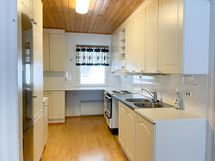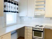 Liesi: sähköliesi. Työtasot: laminaatti. Kylmäsäilytys: jääkaappi/pakastin. Varustus: varattu paikka astianpesukoneelle, kiinteät valaisimet, liesituuletin / hormi.
