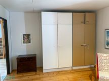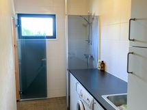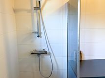 Pesutilojen kuvaus: pesuhuone remontoitu 2023. Varustus: suihkuseinä, pesukoneliitäntä, lattialämmitys, suihku, kiinteät valaisimet. Varustus: peilikaappi, bidee-suihku.