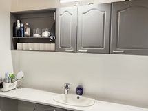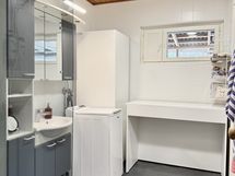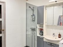 Varustus: suihkuseinä, pesukoneliitäntä, lattialämmitys, suihku, peilikaappi. Varustus: bidee-suihku.