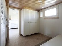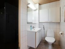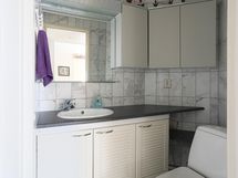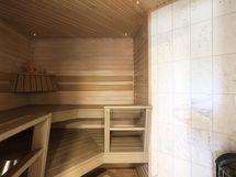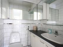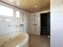 Sauna, sähkökiuas, kylpyhuone, erillinen wc, suihku, poreallas, peilit, peilikaappi, kaapit, allaskaappi, pesukoneliitäntä, lattialämmitys, kiinteät valaisimet.
