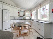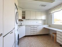 Jääkaappipakastin, kylmiö, erillisuuni, induktioliesi, liesituuletin, mikroaaltouuni, astianpesukone, kaapistot, kiinteät valaisimet, pöytätasojen materiaali.