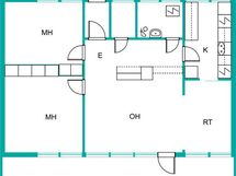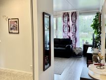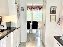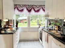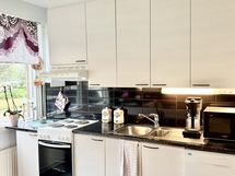Liesi: sähköliesi. Työtasot: laminaatti. Kylmäsäilytys: jääkaappi/pakastin. Varustus: astianpesukone, varattu paikka astianpesukoneelle.