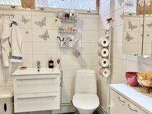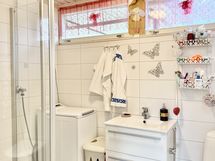 Varustus: pesukoneliitäntä, wc-istuin, suihku, peili.