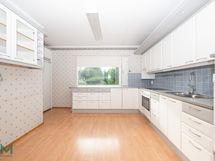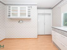 - Jääkaappi (täyskorkea), pakastekaappi (täyskorkea), keraaminen liesi, uuni, liesituuletin hormiin, astianpesukone, pöytätasojen materiaali: laminaatti