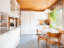 Keittiössä lattiapinnat muovia, seinäpinnat paneloitu /laatta. Keittiöstä löytyvät jääkaappi ja pakastinkaappi, puuhella, keraaminen liesi, astianpesukone, vaaleat kaapistot.