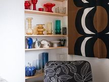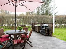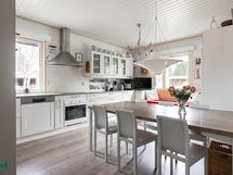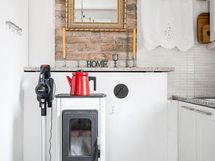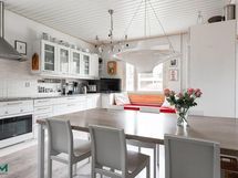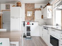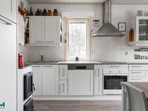 - Jääkaappi/pakastin, induktioliesi, erillisuuni, liesituuletin hormiin, astianpesukone, kivitasot (Royal Beige), Domuksen kaapistot, kamiina