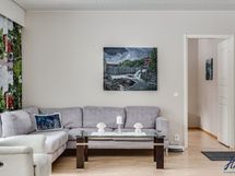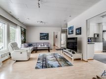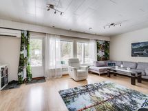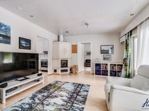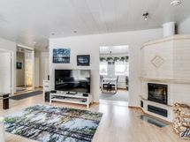 Olohuoneen lattiapinta on laminaattia ja seinäpinnat on tapetoitu. Varaava takka ja kulku takapihan terassille.
