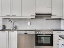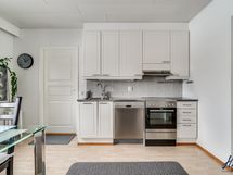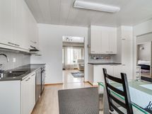 Kaapistot, keraaminen liesi, jää- ja pakastekaappi, astianpesukone. Keittiön lattiapinta on laminaattia ja seinäpinnat on maalattu.