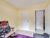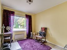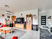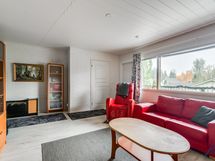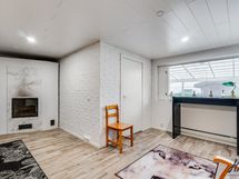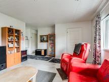 Olohuoneen lattiapinta on laminaattia ja seinäpinnat on osin tapetoitu ja osin maalattu.