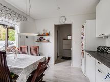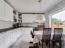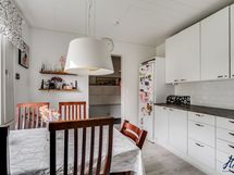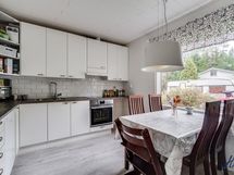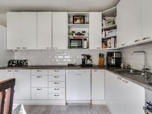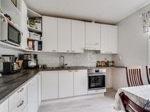 Kaapistot, jääkaappi, induktioliesi, erillisuuni, liesituuletin ja astianpesukone. Keittiön lattiapinta on laminaattia ja seinäpinnat on maalattu. Keittiö on remontoitu 2015.