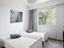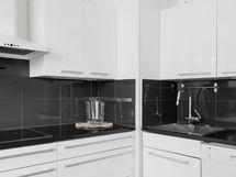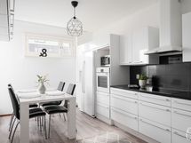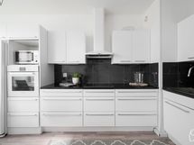 - Valkoiset keittiökaapistot, induktioliesi, jääkaappipakastin jääpalakoneella, kiertoilmauuni, astianpesukone, liesituuletin, liesivahti. Lattia laminaatti, välitila laattaa, työtaso kiveä.