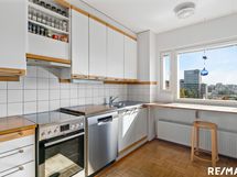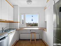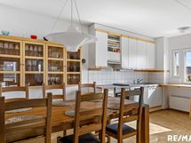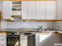- Keittiössä on jää/pakastinkaappi (2018), induktioliesi/uuni (2022), liesituuletin (suodatin, 2014), astianpesukone (2023). Vaaleat kaapistot, puiset työtasot. Keittiöön mahtuu ruokapöytä. Seinät maalattu, lattia parkettia.
