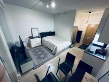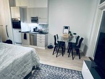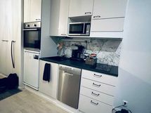 Liesi: induktio, erillisuuni. Kylmäsäilytys: jääkaappi. Varustus: liesituuletin, astianpesukone.