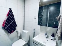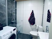 Varustus: pesukoneliitäntä, lattialämmitys, wc-istuin, suihku, peilikaappi.