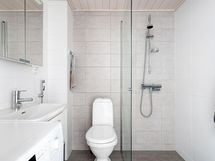 - Suihku ja -seinä, allaskaappi, valollinen peilikaappi, käsisuihku, wc-istuin, upotetut kattovalot, mukavuus lattialämmitys, kph-kaappi