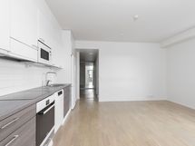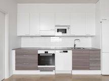 Keittiön varusteet: Jääkaappipakastin, liesituuletin ja astianpesukone. Työtason materiaali: Laminaatti. Tyylikäs avokeittiö laadukkailla kodinkoneilla, jääkappipakastin, keraaminen liesi, integroitu apk ja laminaattitasot - tyylikäs kokonaisuus.