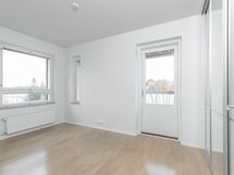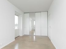 Erilliset makuuhuoneet asunnon molemmissa päädyissä antaa rauhaa työskentelylle, lastenhuoneelle ja päämakuuhuoneesta kivasti suoraan lasitetulle isolle parvekkeelle.