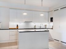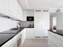 - Valkoiset kaapistot, kivitasot, jääkaappi, pakastin, astianpesukone, erillisuuni- ja taso, liesikupu/-tuuletin