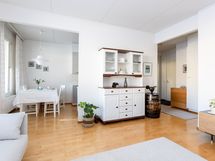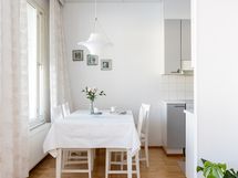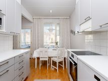 - Tilaa isolle ruokapöydälle, Paljon kaappitilaa, Paljon työskentelytilaa, Suuri tiskipöytä, Laminaattitasot, Astianpesukone, Pesukoneliitos, Keraaminen liesi, Liesituuletin, Jää-pakastinkaappi