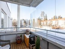 - Iso, lasitettu parveke, yhdellä sivulla aurinkosuojaverhot