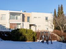 - Talo päättyvän tien päässä. Näkymät tielle, toisella puolella rivitaloyhtiö, puita edessä.