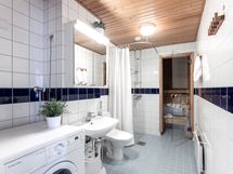 - Suihku, Pesukonevalmius, Peilikaappi, Laattalattia, Laattaseinä, Lattialämmitys