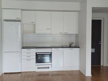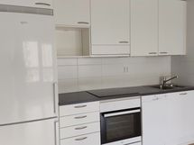 - Jääkaappi-pakastin, keraaminen liesitaso, erillisuuni, liesituuletin, astianpesukone, kiinteät valaisimet, työtaso harmaa laminaatti