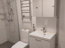 - Lattialämmitys, suihku, suihkuseinä, pesukonevalmius, peilikaappi, allaskaappi, laattalattia, laattaseinä, wc-istuin, bidee-suihku, pesuallas ja laatikosto, kiinteät valaisimet