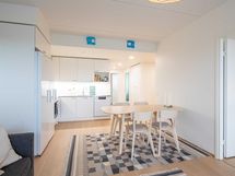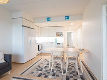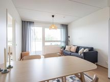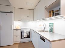 Keittiö on L-mallinen ja yhtenäistä avaraa tilaa olohuoneen kanssa. Myös ruokapöydälle löytyy oma paikkansa.
