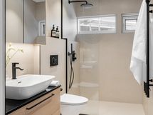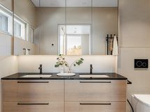 - Pesutilojen kuvaus: Tässä kodissa on kolme kylpyhuonetta. Yksi sijaitsee päämakuuhuoneen yhteydessä, yksi on yhteinen kahden makuuhuoneen kanssa ja yksi on saunan yhteydessä oleva pesutila. Kaikki kylpyhuoneet ovat korkealaatuisesti ja saman tyylin mukaisesti sisustettuja. Lattiat ja seinät ovat kaikissa 71x71 Dekton -laattaa. Lattioissa on Grip+ liukkaudenestopinta ja linjakaivot. Kaikissa on mittatilauskalusteet sekä Tapwellin-vesikalusteet. Katot ovat alas laskettuja Stretch-PVC sisäkattoja paitsi saunaosaston katto on lämpökäsiteltyä magnolia-paneelia. . Erillisen WC:n kuvaus: Erillinen wc eteisessä ja saunan pukeutumistiloissa. Muut wc-istuimet kylpyhuoneiden yhteydessä. Yhteensä 4 wc-istuinta.