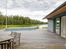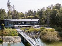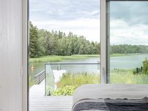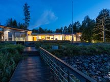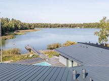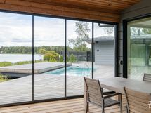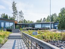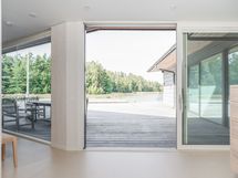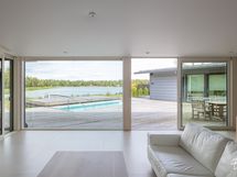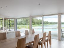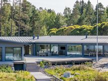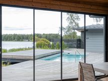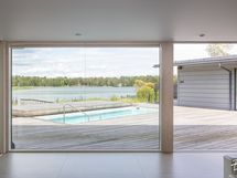 Suurista ikkunoista aukeaa huikea merimaisema. Keittiöstä pääsee kätevästi liukuoven kautta edessä olevalle meriterassille ruokailemaan ja nauttimaan maisemista.